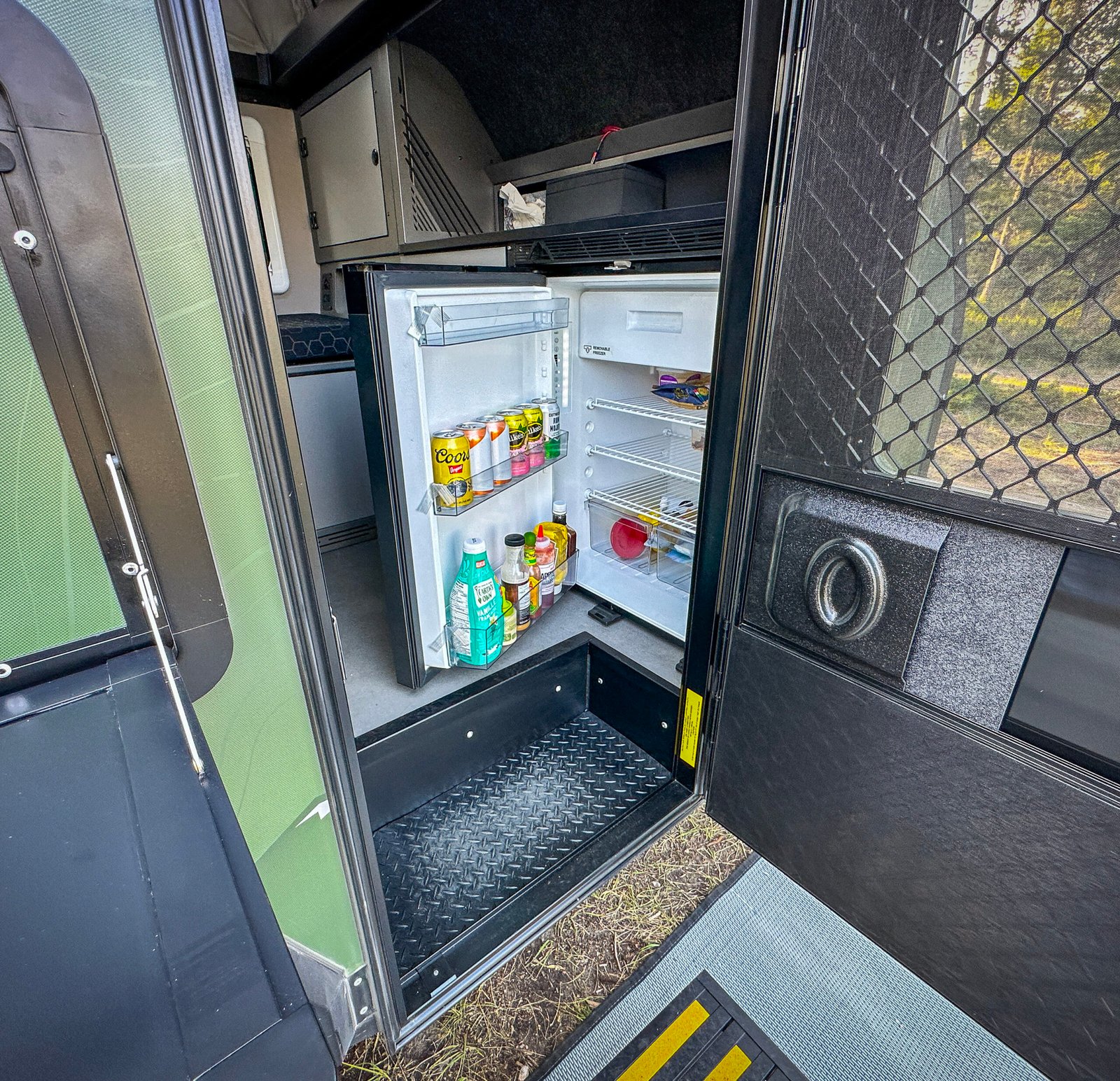 A purpose-built outdoor kitchen designed for real travel. With a dedicated pantry for dry goods, pots, and pans, a smart U-shaped layout, and all the essentials—sink with hot/cold water, two-burner stove, and fridge/freezer — cooking stays easy at any campsite.