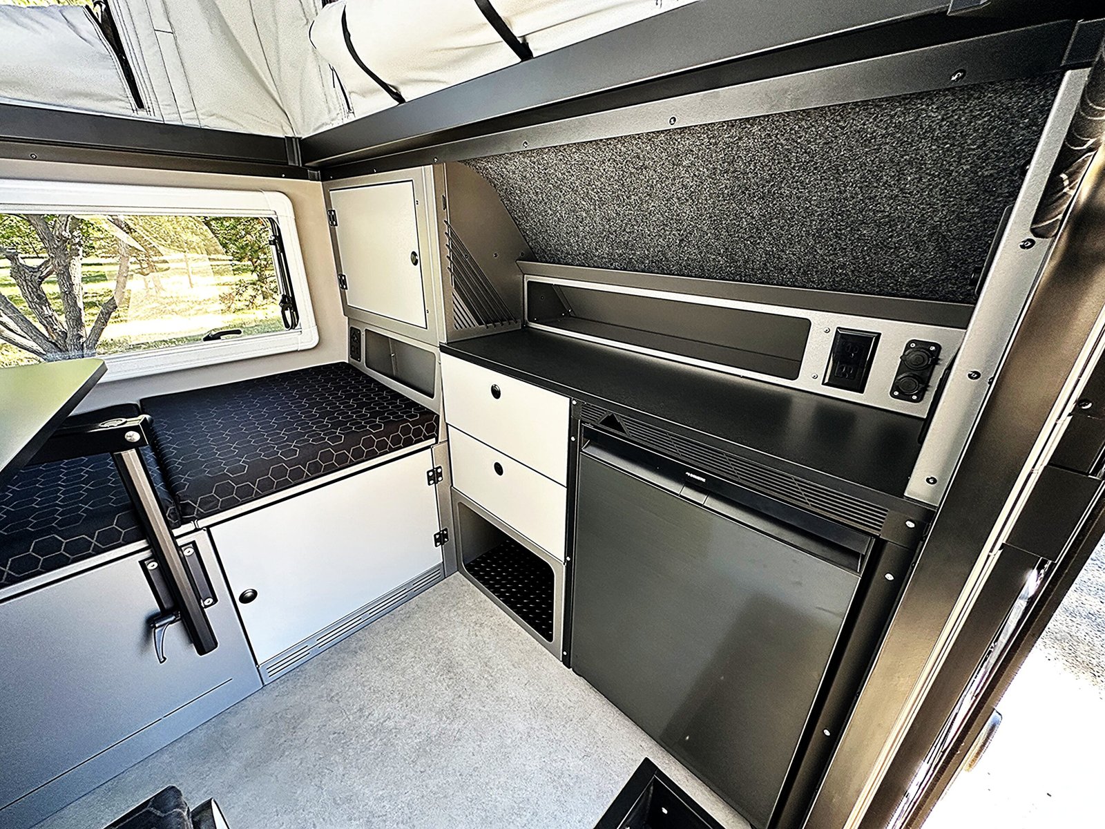 Our cabinetry is laser-cut, formed, and powder-coated aluminum, along with composite cabinet doors, to eliminate any mold, mildew, or warpage issues that traditional overland travel trailers can experience.